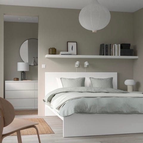 IKEA säng Malm med förvaring i vit färg. Sängen har en resårmadrass av modell Hövåg, medelfast och en sängram med inbyggda utdragslådor för extra förvaringsutrymme. Passar som enkelsäng i sovrum eller gästrum. Vit träram med rak, hög gavelform och lådor på sidan för praktisk förvaring av till exempel sängkläder eller textilier.