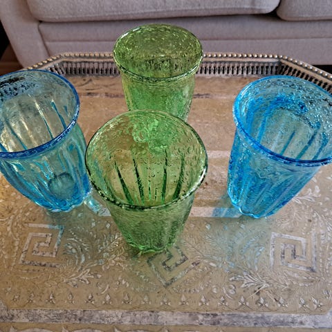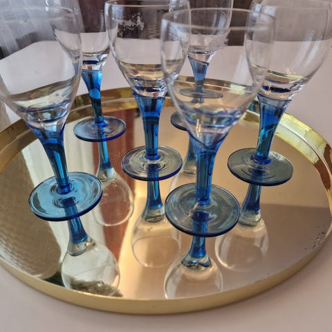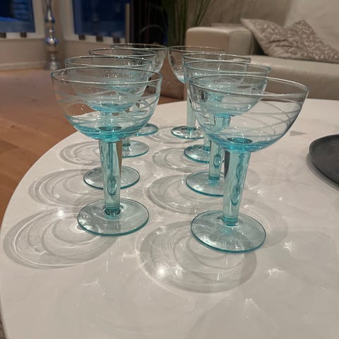 5 vinglas med blå fot. 4 färgade vinglas. 6 blå champagneglas. 2 champagneglas med blå fot. 2 champagneglas från Duka. 1 blå stor skål. 4 blå mindre skålar. Fint skick.