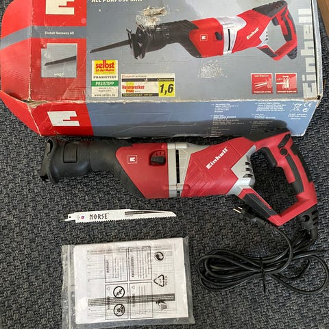 Millarco tigersåg med kabel i hård förvaringsväska. Sågen har ergonomiskt handtag och är avsedd för kapning och sågning i olika material beroende på val av blad. Levereras med elkabel och tillbehör enligt bild, samlade i en plastväska för enkel förvaring och transport.
