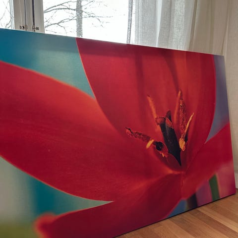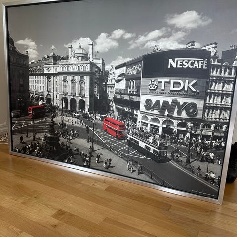 IKEA tavla med fotografiskt Londonmotiv. Bilden visar klassiska röda telefonkiosker mot en svartvit stadsmiljö i bakgrunden. Tavlan är inramad och avsedd för väggupphängning i inomhusmiljö. Passar som väggdekoration i till exempel vardagsrum, sovrum eller hall.