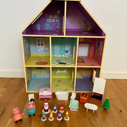 Greta Gris dockhus i plast med flera rum och tre våningar. Huset är gult med rött tak och öppen baksida som visar inredda rum som kök, vardagsrum, badrum och sovrum. Till dockhuset följer lösa tillbehör: badkar, fåtölj, bord, 3 stolar, dator med bord, badkar, korg samt en Greta Gris-figur. Passar för barn som vill leka med figurer och möblera huset på olika sätt. Höjd: 34 cm, djup: 16 cm och bredd 36 cm. Knappt använt.