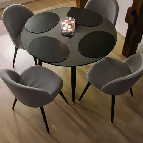 Säljer en matgrupp med 4 stolar, i nyskick! Bordet är i trä med svart färg, solarna är i grå sammet.