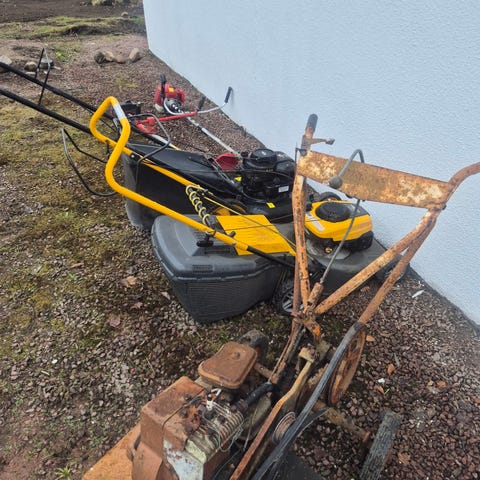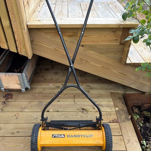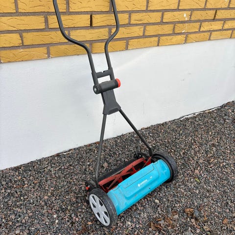 Fin gammal gräsklippare. Behöver justeras för att klippa bra. Annars är den fin som trädgårdsprydnad.
