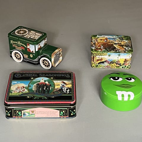 Säljer ett parti äldre burkar, mestadels i plåt.