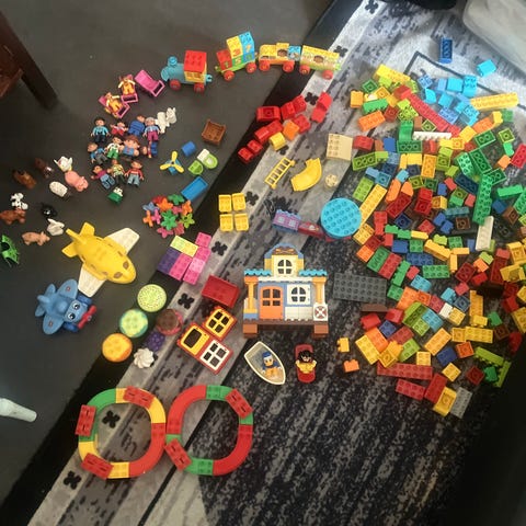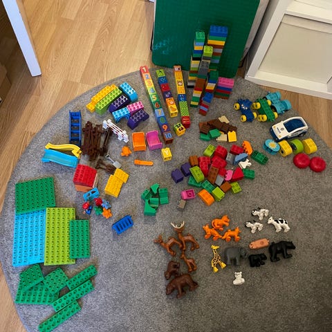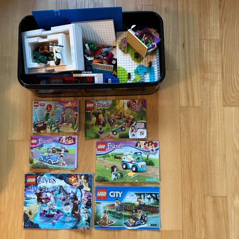 LEGO Minecraft byggset med blandade delar och figurer. Flera olika Minecraft-inspirerade byggen syns på bilderna, tillsammans med lösa klossar i olika färger och former samt gröna byggplattor. Passar för lek, eget byggande och komplettering av befintliga LEGO Minecraft-samlingar.