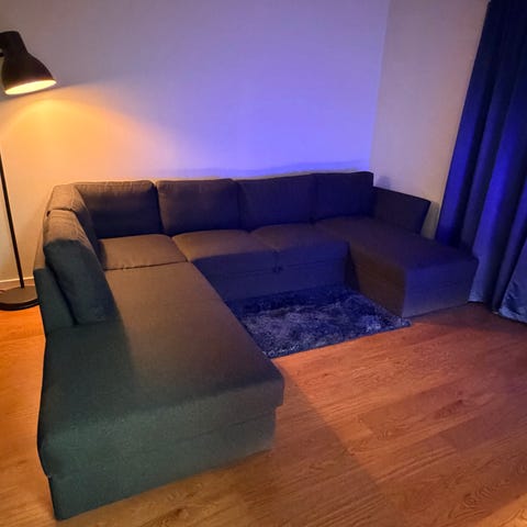 Säljer en soffa från ikea som består av 1-sitdel och 1 hörnsektion. Tyget är mörkgrå, slät, 3 stora kuddar, 2 små.