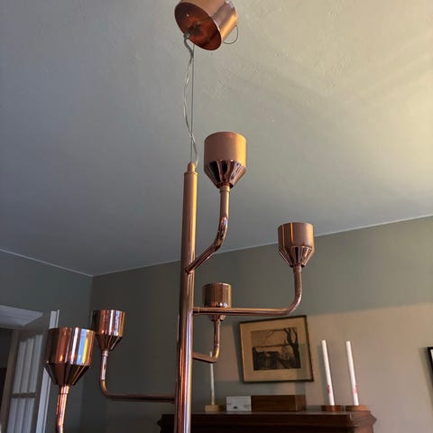 taklampa oklart vilken designer. Lampan är utförd i metall med rörformad stomme och fyra ljuskällor. Konstruktionen har detaljer i metall, inklusive en ventilformad mittdel. Passar som allmänbelysning i exempelvis vardagsrum, kök eller matplats.