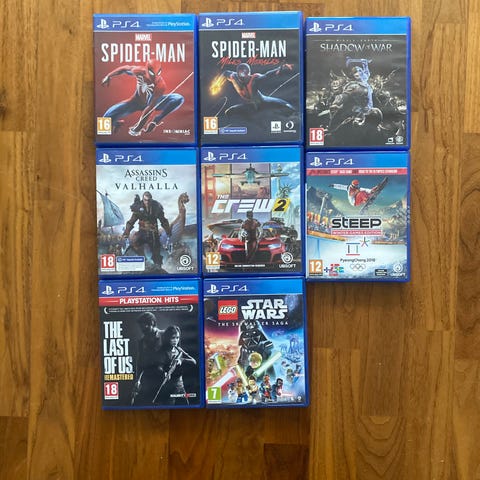 Sony Playstation 4 spelpaket med sex olika titlar: Battlefield, Need for Speed, Minecraft, Cars, Red Dead Redemption 2 och Lego Marvel. Spelen är i fysiskt format på skiva och levereras i sina respektive PS4-fodral. Passar Playstation 4-konsoler och kan användas för en blandning av action, äventyr, bilspel och familjevänligt spelande beroende på titel. Priset i bilen