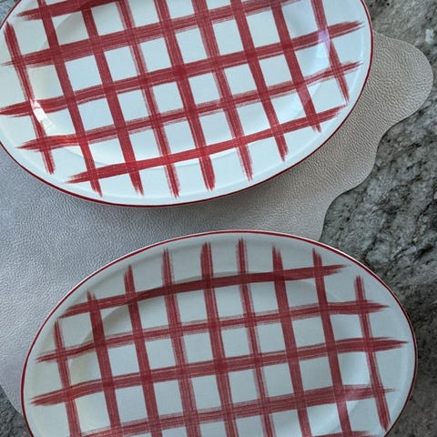 Rusta tallrikar i porslin med grönt och vitt randigt respektive blockmönstrat dekormönster. Setet består av tallrikar i två olika mönster, lämpliga som mattallrikar och assietter. Passar för servering av vardagsmåltider och enklare dukningar i kök eller matsal.