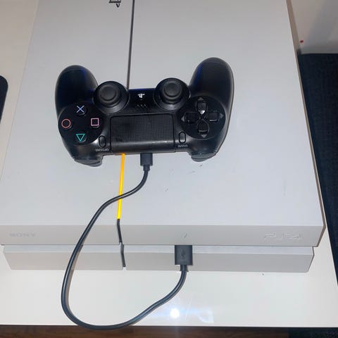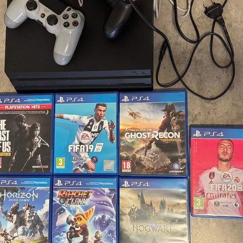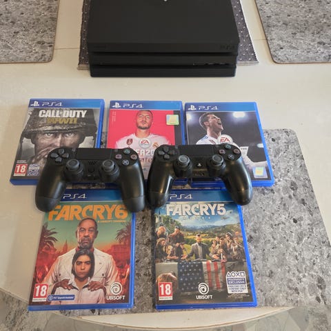 Sony Playstation 4 Pro spelkonsol svart med handkontroller och spel