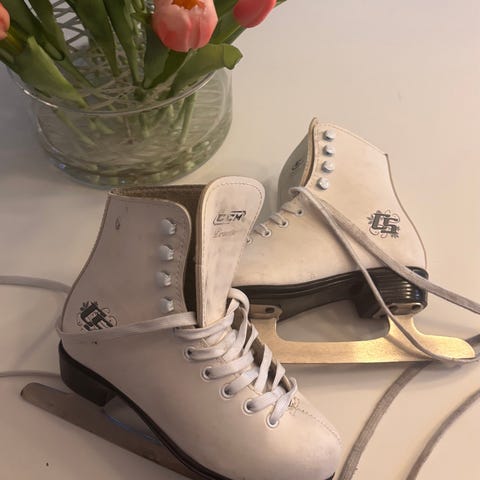 Graf Victoria konståkningsskridskor i storlek 34. Vita skridskor med snörning och svart klack.