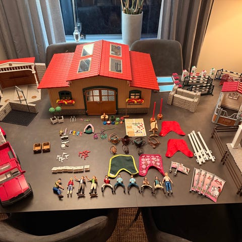 Schleich hästlekset med flera hästfigurer, stallbyggnader, fordon och tillbehör. Ett av stallen är inte till fullo ihopbyggt. Setet innehåller ett flertal hästar i olika färger, flera fordon såsom hästtransport och två veterinärbilar, stall och hagar samt smådelar som sadlar, träns, foder och andra hästrelaterade tillbehör. Passar för lek med hästgård och lantbruksmiljö.