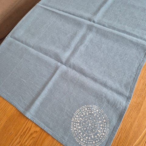 Vit duk med blomstermönster i korsstyg och spetskanter. 139x145 cm.