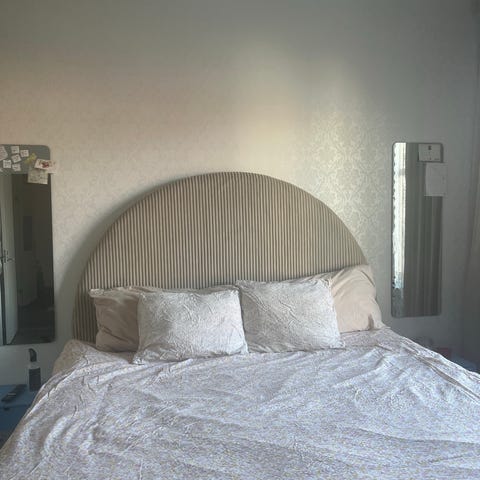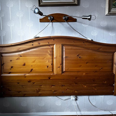 Mio sänggavel i grå textil med knapptuftad, vadderad framsida. Gaveln är avsedd att placeras bakom säng och ger ett mjukt stöd bakom kuddar och rygg. Passar som inredningsdetalj i sovrum och kan kombineras med olika sängramar och bäddningar i liknande eller kontrasterande färger.