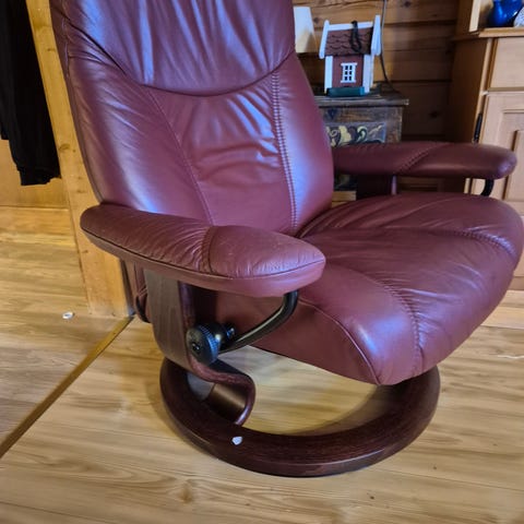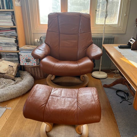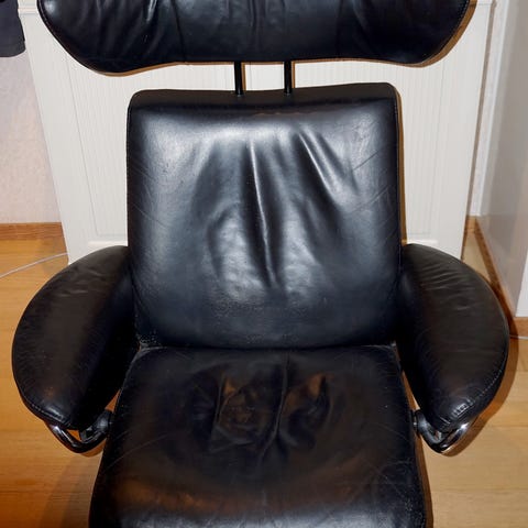 Ekornes fåtölj med tillhörande fotpall. Superskön. Steglös inställning för lutning.