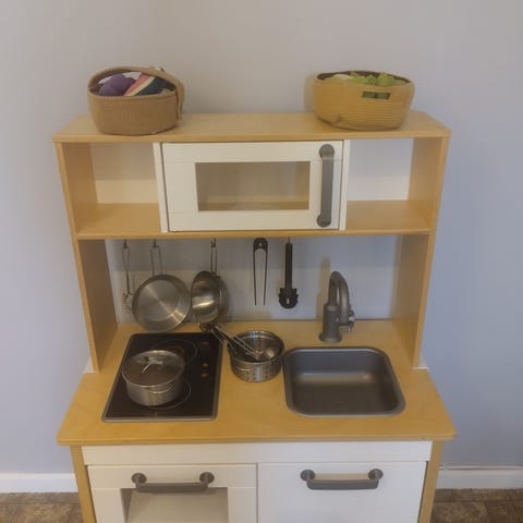 Min son säljer sitt leksakskök med massor av tillbehör.