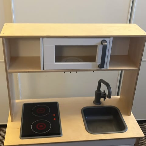 Det är barnköket ”Duktig” i björk från Ikea. Vi har satt på vred till ugnen och belysning under taket.
