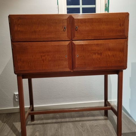 Ett stabilt och gediget skåp som fungerar lika fint som barskåp, vitrinskåp eller klassiskt linneskåp. Mindre bruksspår finns, vilket är naturligt för ålder och bidrar till möbelns charm.