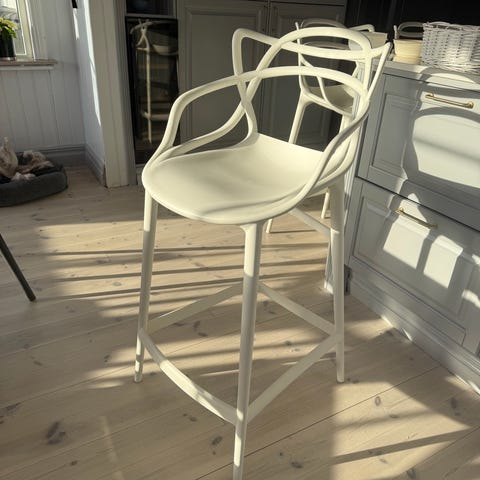 2 st vita barstolar Spoon från varumärket Kartell säljes. Stolarna är använda som barstolar vid köksö men kan även användas som kontorsstol. .De är höj- och sänkbara med sitthöjd från 58 till 77 cm. Även snurrbara.