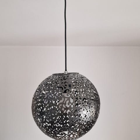 Vit taklampa i metall. Ger ifrån sig ett fint ljus/mönster då den har små prickar som släpper igenom ljus.