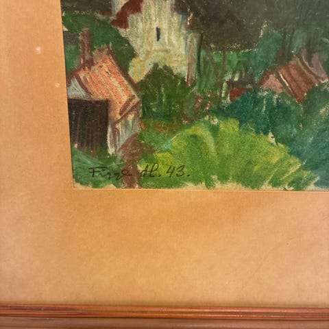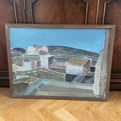 Oljemålning på duk med hamnmotiv i starka färger. Målningen visar bland annat båtar, byggnader och master mot blå bakgrund. Verket är signerat i nedre hörnet, men konstnären är okänd. Tavlan är inramad i en profilerad träram med ljus front och mörkare innerkant. Passar som väggdekoration i exempelvis vardagsrum, hall eller kontor.