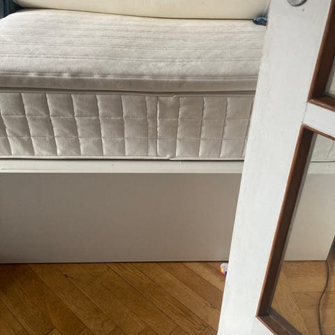IKEA resårmadrass i vitt med grå sidor. Madrassen är rektangulär och passar till sängram med motsvarande mått. I sale it with the topper. Needs to be pick up before 28th Feb