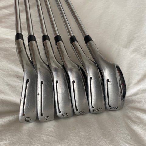 Set med flera golfklubbor 2-Sand wedge. Duplikat av järn 5- och 8 samt pitch. Varierande skick men samtliga fungerar som förväntat. Pitchen längst ner behöver fästas om i skaftet och samtliga tål att greppas om, med undantag för ena järn 8an som jag satte ett nytt grepp på i somras.