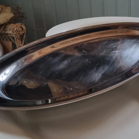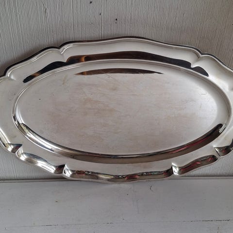 Stor serveringsbricka / stort serveringsfat i nysilver. Har patina från sin ålder, men väldigt vacker.