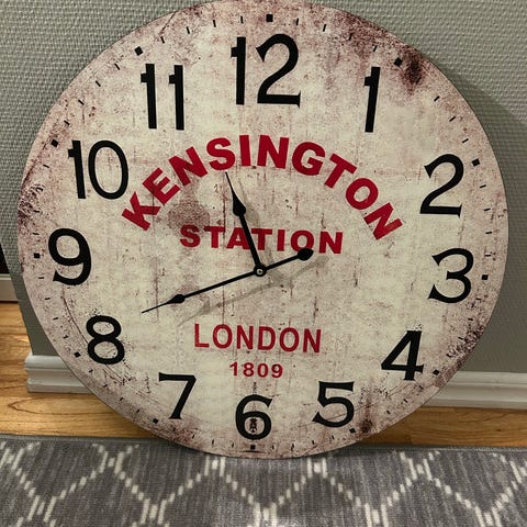 Rund väggklocka i silver/svart.