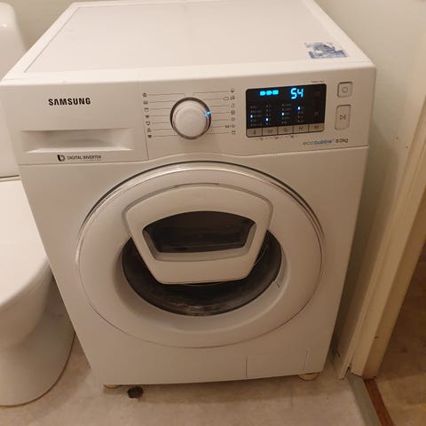 Samsung frontmatad tvättmaskin i vit färg.