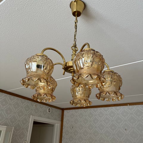 Taklampa i glas, 6-armad, venetiansk / klassisk stil med prismor. Några prismor behöver fästas. Guldfärgade lampetter medföljer.