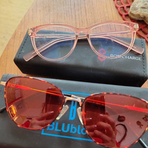 Dessa är i tortoise bågar, neutrala glas. Väldigt lätta på, märks knappt för att de är så lätta.