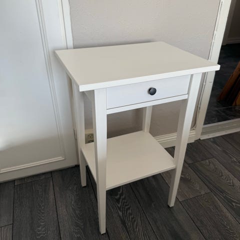 Sängbord från Mio i fint skick. Vit med en grå stenskiva samt hyllplan. Stabilt och utan anmärkning.