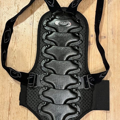 Ryggskydd för barn. Hårda skyddsplattor framtill med justerbara axelremmar och bredt midjebälte med kardborreknäppning. Mått längd cirka 40 cm enligt måttband på bild.