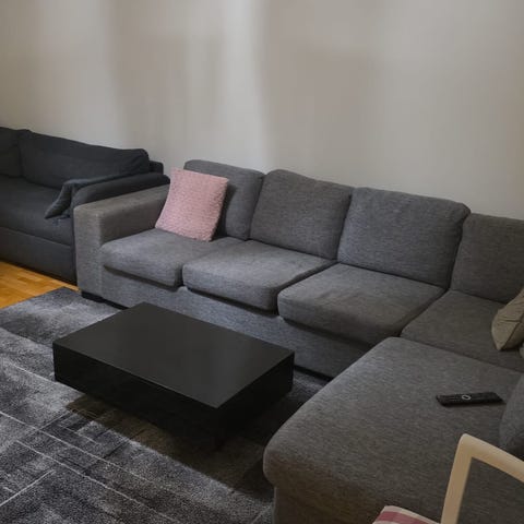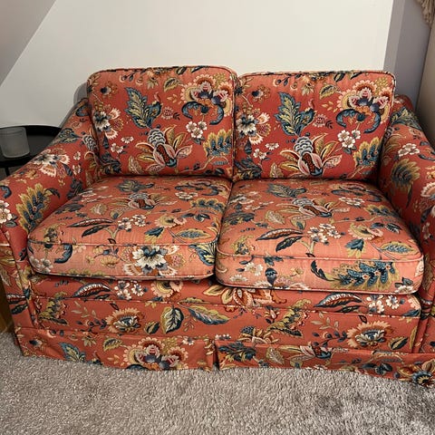Bekväm soffa i rosa sammet. Använd men fortfarande helt funktionell.
