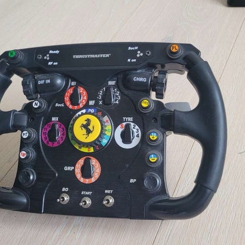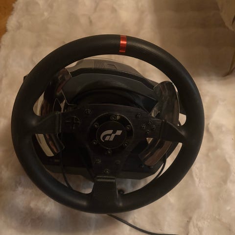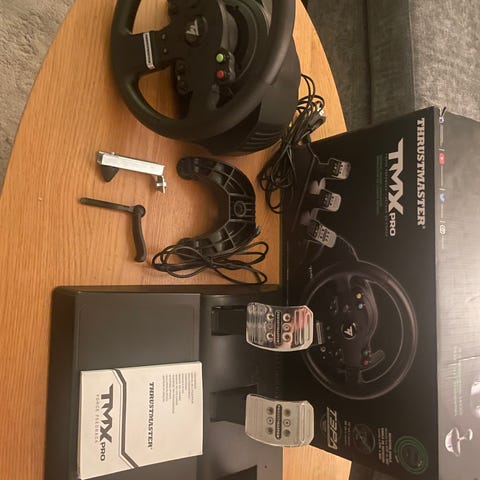 Thrustmaster TX racerratt med pedaler i svart färg. Setet består av en rattbas med monterad ratt samt en pedalbas med tre pedaler (gas, broms, koppling) Ratten har flera knappar och reglage för styrning i bilspel och racingsimulatorer. Pedalenheten är fristående och ansluts med kabel till rattbasen. Passar för användning tillsammans med kompatibla Xbox konsoler eller dator. Den är använd. Vid längre och tyngre force feedback körning så överhettar forcefeedback motorn och lägger av. Men vid omstart fungerar den igen. Ratten och pedalerna fungerar men forcefeedbacken överhettas.
