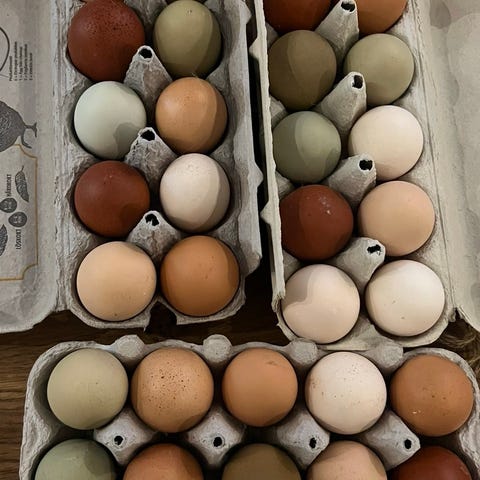 Tuppen var CL och hönorna blandras som lägger gröna/ turkosa/bruna ägg.