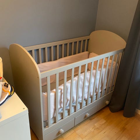 IKEA spjälsäng med förvaringslådor grå