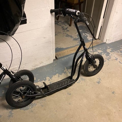 Stiga sparkcykel i svart färg. Utrustad med luftfyllda däck fram och bak samt handbromsar. Stabil ståplatta och styre med greppvänliga handtag. Passar för användning på plana underlag som gång- och cykelvägar.