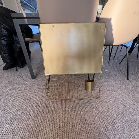 Väggdekor/ anslagstavla i kallbeige metall från märket Habitat. Jag har använt den ovanför skrivbord som anslagstavla/ inredningsdetalj. Nyskick! Fästs med två spikar i vägg. Färgen är greige, kallbeige. Mått: 90x90. Nypris 900 kronor. Mitt pris 499 kr. :) Metallstängerna fungerar mkt bra med magneter så man kan ha den som anslagstavla.