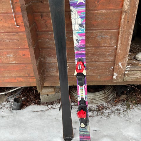 Atomic slalomskidor med bindningar. Skidorna är avsedda för utförsåkning/alpint och har integrerade bindningar monterade. Passar för åkning i pist. Färgkombination med bland annat vitt, blått och rött.