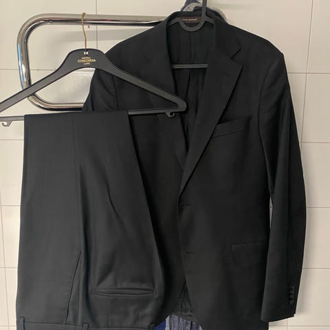 Kostymen är svart och såväl kavaj som byxor är i storlek 50.