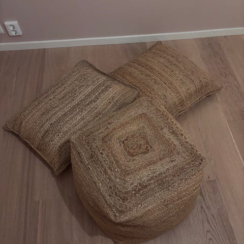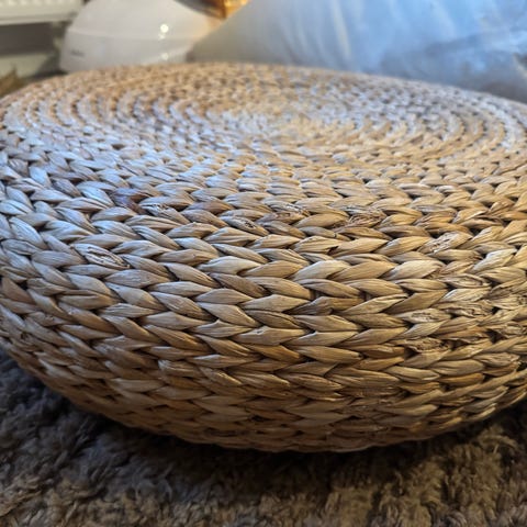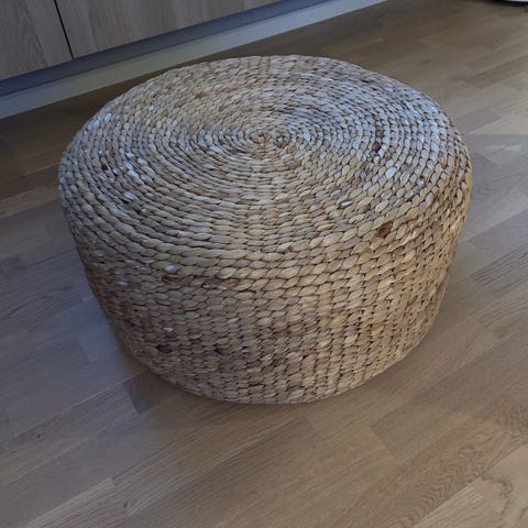 IKEA golvpuff i flätat naturmaterial i rund modell. Färg i naturton. Passar som extra sittplats eller fotpall i vardagsrum, sovrum eller hall.