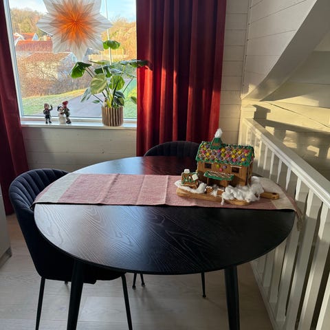 Runt matbord med tillhörande stolar i svart trä från Ikea.
