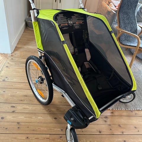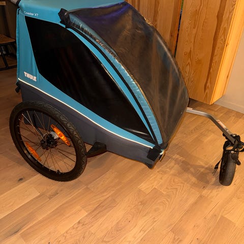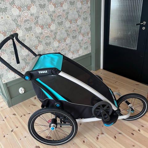 Thule Chariot CX cykelvagn / joggingvagn med spädbarnsinsats och två dragkrokshållare för att enkelt flytta vagnen mellan två cyklar. Inbyggt sol- och regnskydd. Rymlig förvaringsficka. Gott skick, förutom handbromsen som behöver repareras. Priset är satt med hänsyn till detta. Endast avhämtning i Uppsala.
