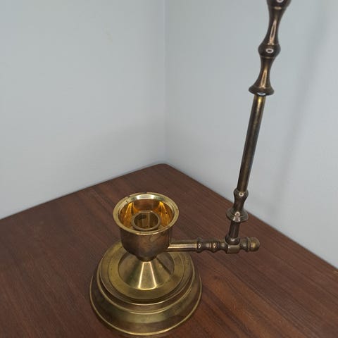 Vattenkanna i mässing med handtag och pip. Kannan har en smal, konformad kropp och flera utstickande delar upptill, troligen för finfördelad bevattning eller dekoration. Passar som praktisk vattenkanna eller som inredningsdetalj. Exakt volym och mått är okända.