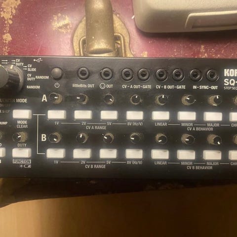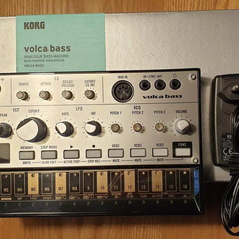 Korg Volca Modular, en semi-modulär analog synt med inbyggd sequencer. Patchpunkter för modulär koppling, olika oscillator- och modulationssektioner samt filter och envelope-kontroller.