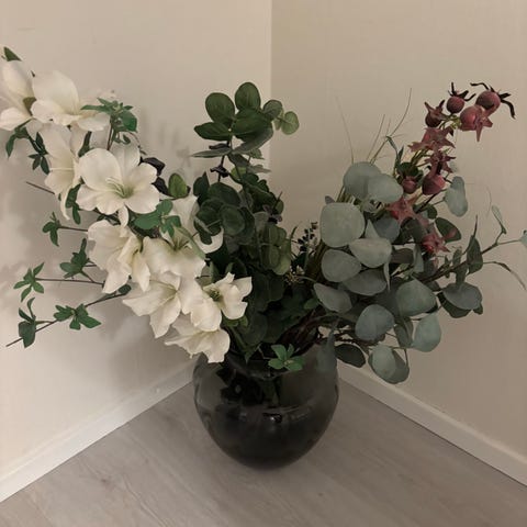 Säljer en rund vas i glas med tillhörande plastblommor. En lättplacerad dekoration som passar fint på bord, hylla eller fönsterbräda. Perfekt för dig som vill ha något som alltid ser fräscht ut och inte kräver skötsel.