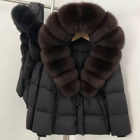 Tjock dam vinterjacka med riktigt päls i kapuschongen