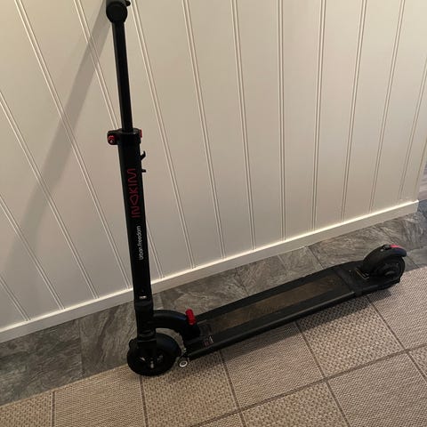 Elektrisk trehjulig scooter i svart färg. Modellen har ett framhjul och två bakhjul med låg sitthöjd och styrhandtag framtill. Fordonet är avsett för en person och lämpar sig för körning på plana underlag som asfalt eller andra hårda ytor. Passar för kortare transporter eller fritidskörning där trehjulskonstruktionen ger extra stabilitet jämfört med en traditionell tvåhjulig elscooter.